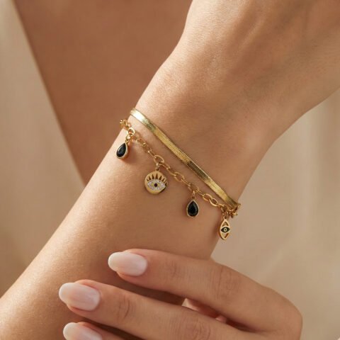 Gold Plated Anti‑Tarnish Evil Eye Charm Bracelet | Luxury Modern Minimal Bracelet for Women