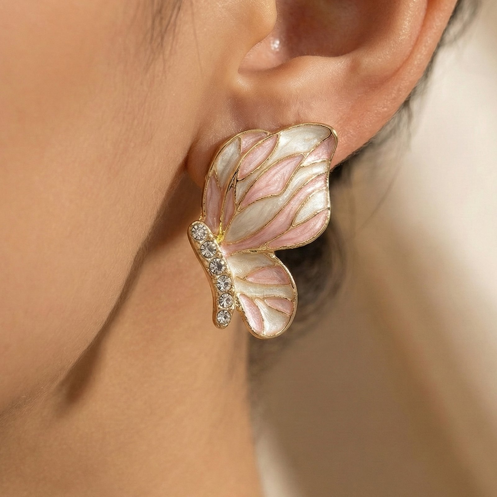Soft, feminine, and effortlessly elegant, the Aurla Blush Flutter Earrings are designed to add a subtle touch of luxury to your everyday style. Featuring a graceful butterfly silhouette with blush pink and ivory enamel detailing and delicate crystal accents, these earrings strike the perfect balance between charm and sophistication.