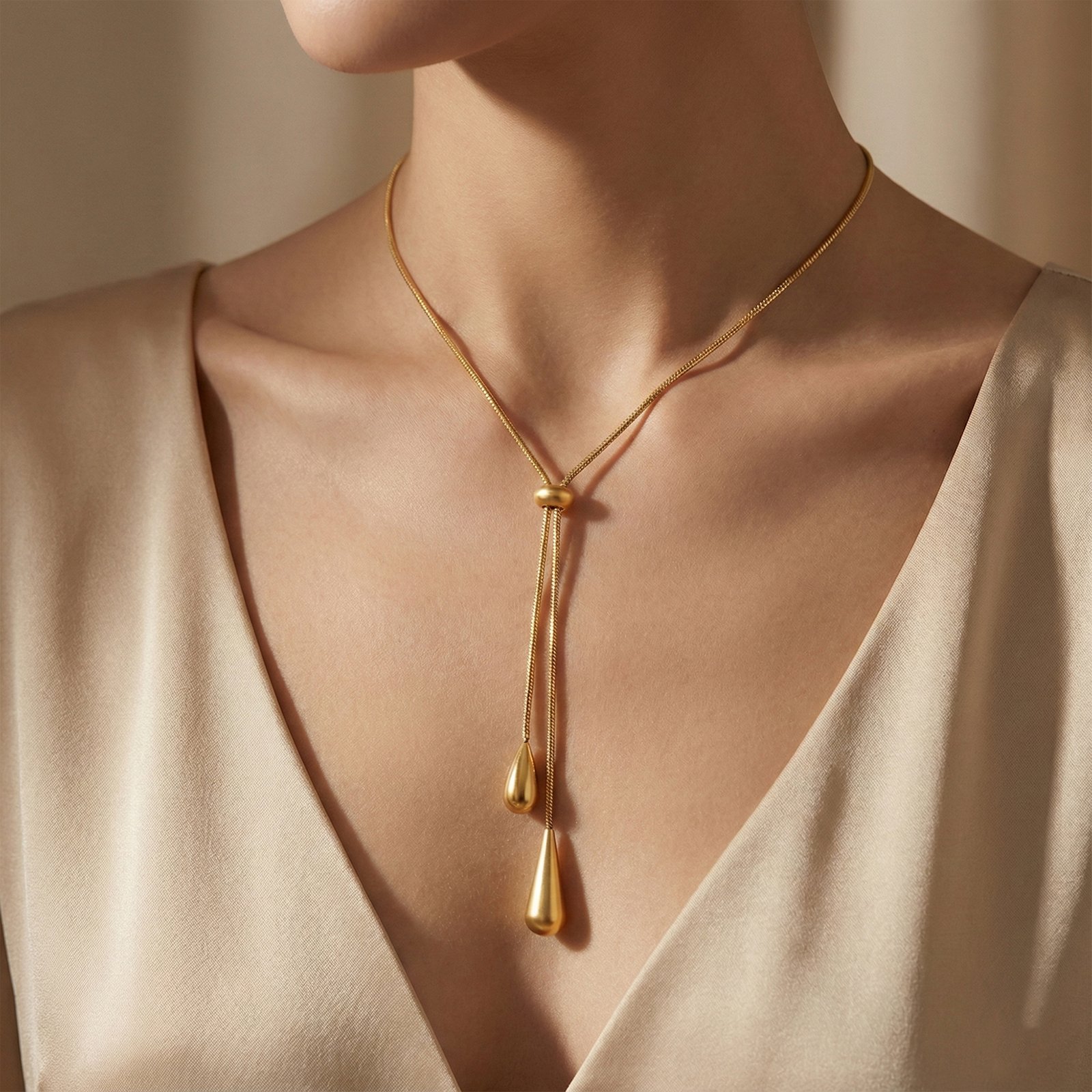 Its slender gold‑plated chain falls into two sculpted droplet charms, creating a graceful Y‑silhouette that elongates the neckline beautifully.